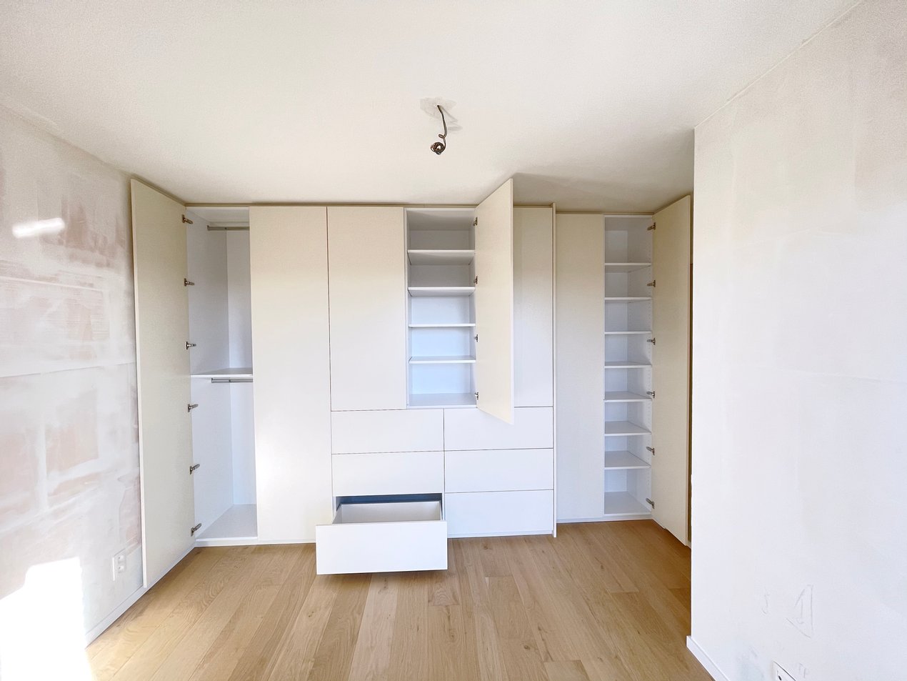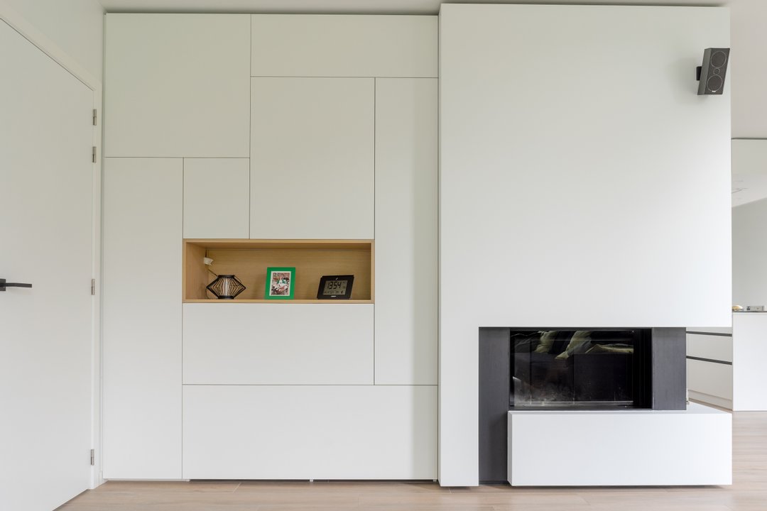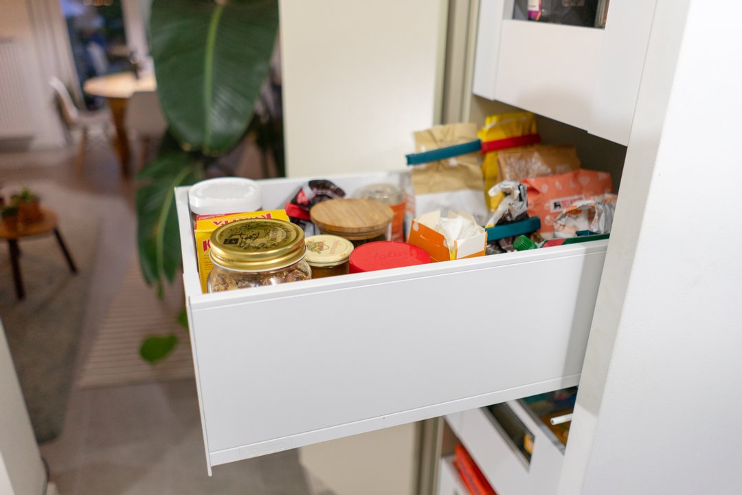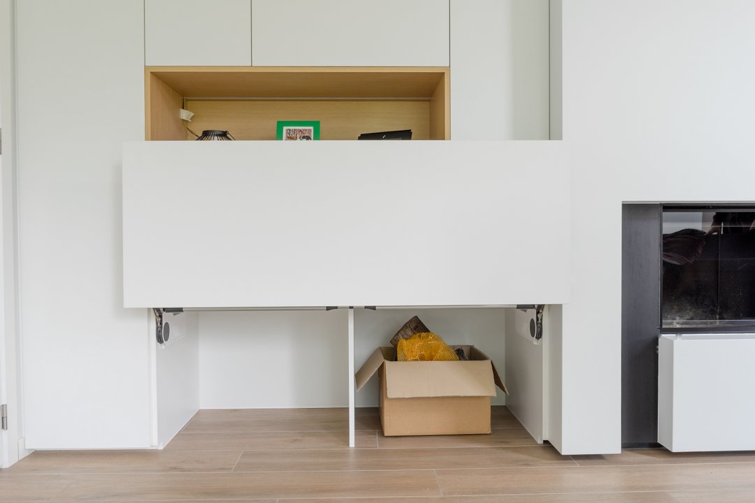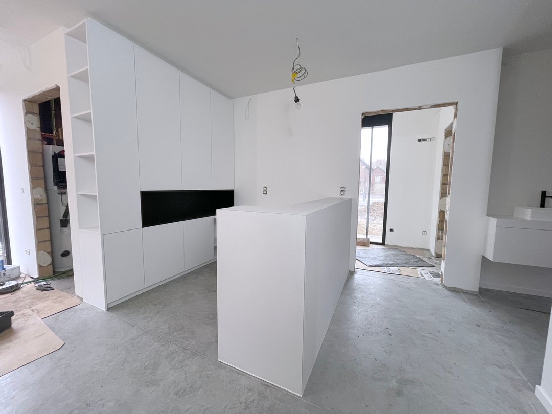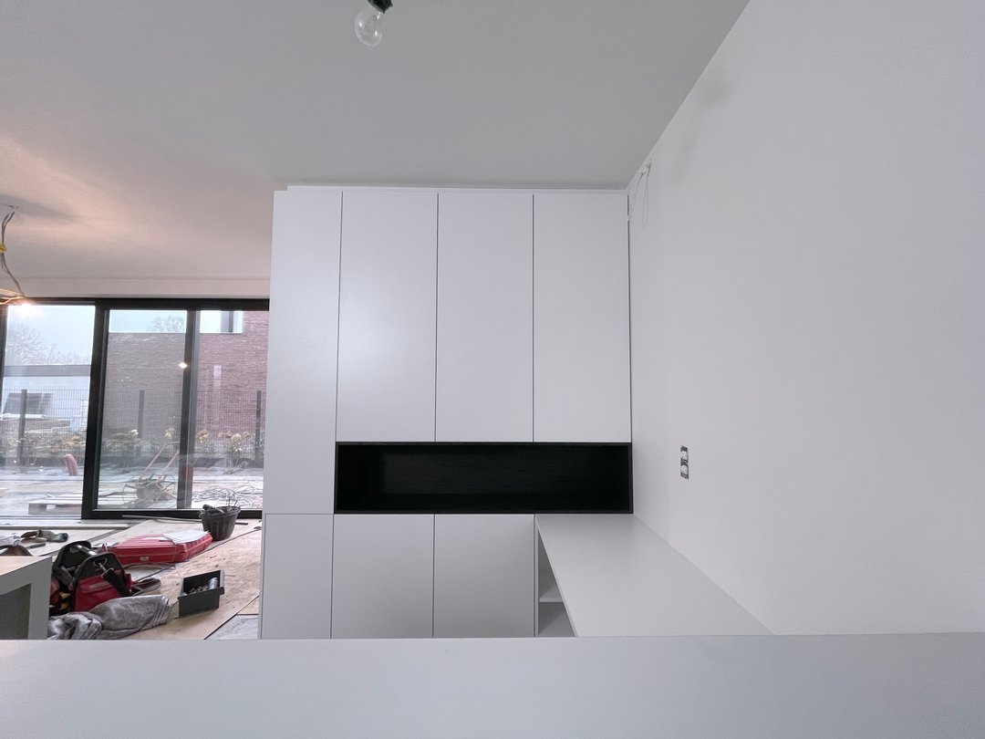 Om optimaal gebruik te maken van de oppervlakte van deze kamer zijn de kasten achter de deur minder diep. De kastdeuren en lades zijn te openen via tip-on. De kasten slaan steeds rustig dicht door middel van de blumotion scharnieren. Voor dit project kozen we de kleur van de kasten zodat ze mooi overeen zullen komen met de te verven muren.
