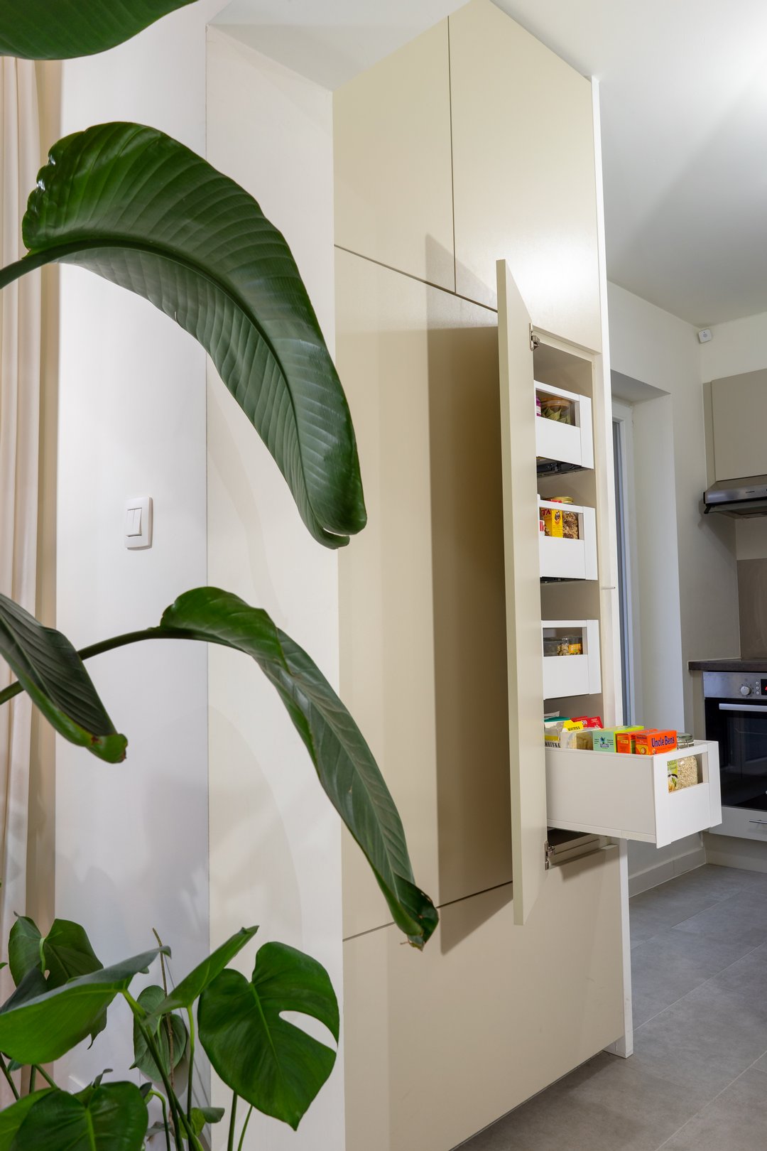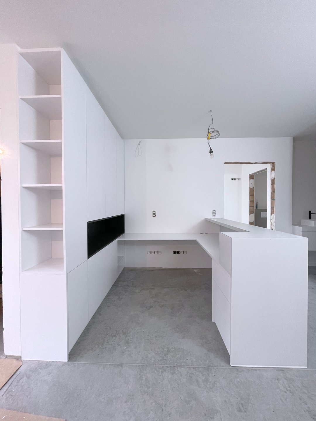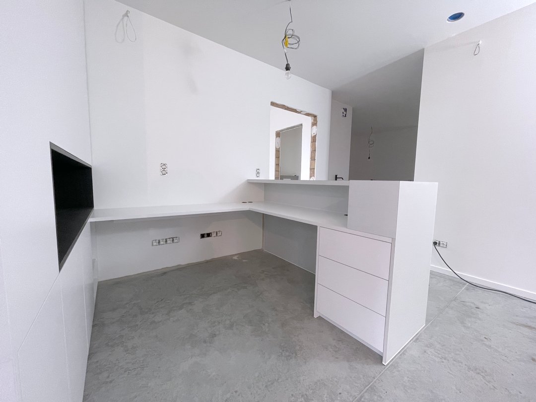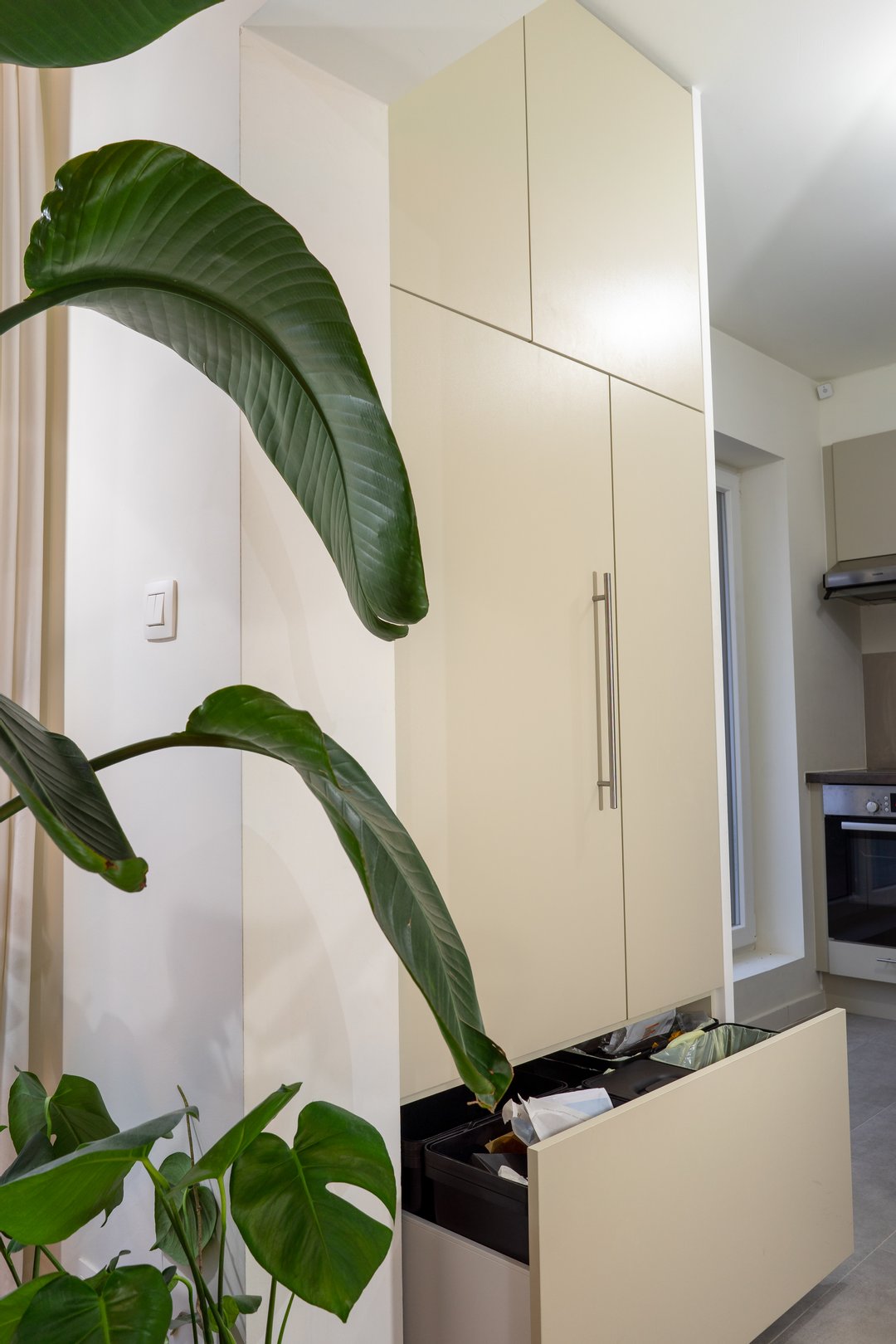 Om optimaal gebruik te maken van de oppervlakte van deze kamer zijn de kasten achter de deur minder diep. De kastdeuren en lades zijn te openen via tip-on. De kasten slaan steeds rustig dicht door middel van de blumotion scharnieren. Voor dit project kozen we de kleur van de kasten zodat ze mooi overeen zullen komen met de te verven muren.