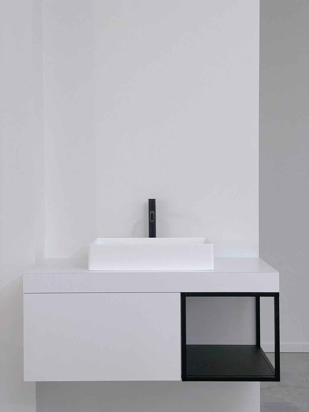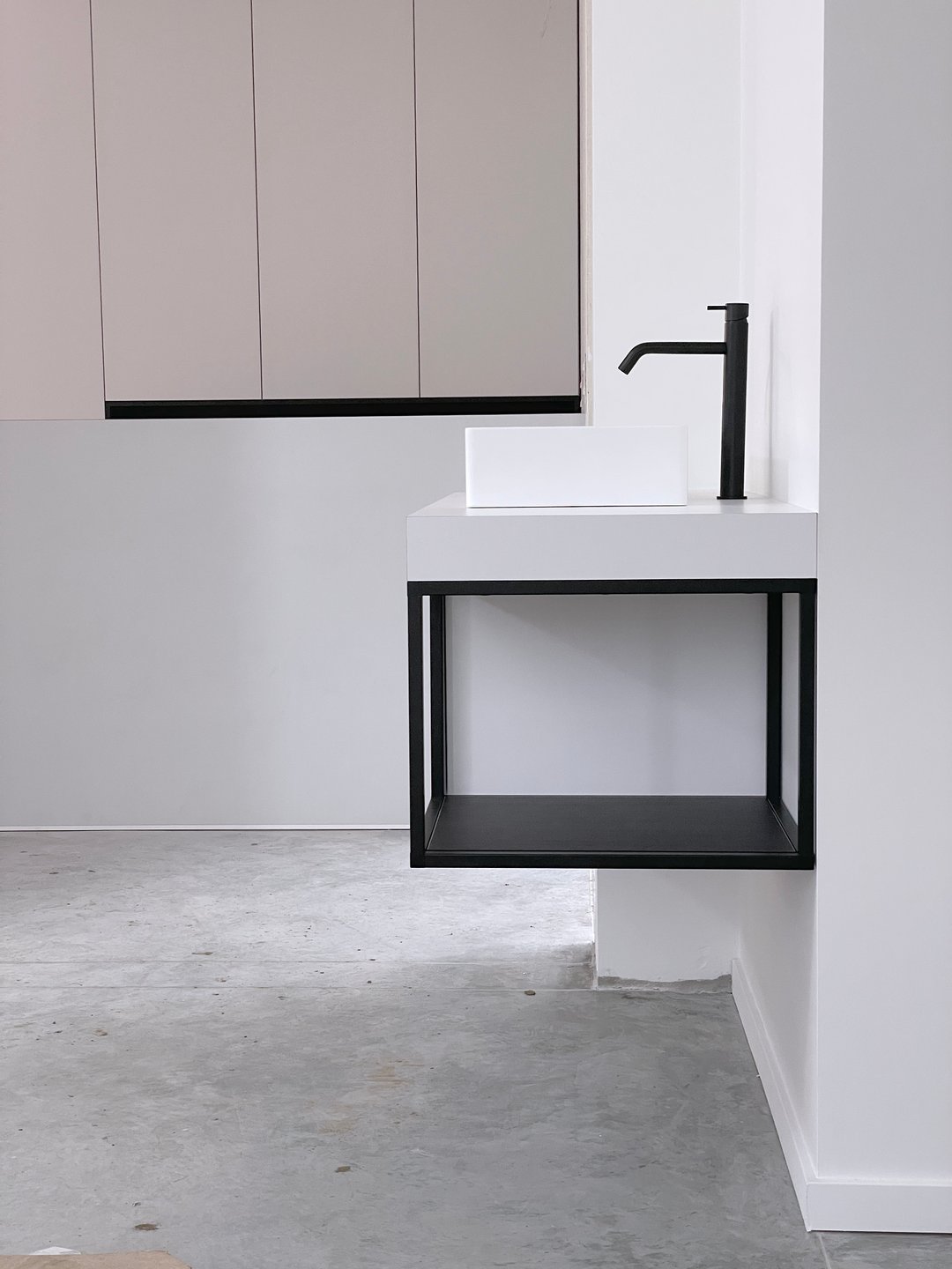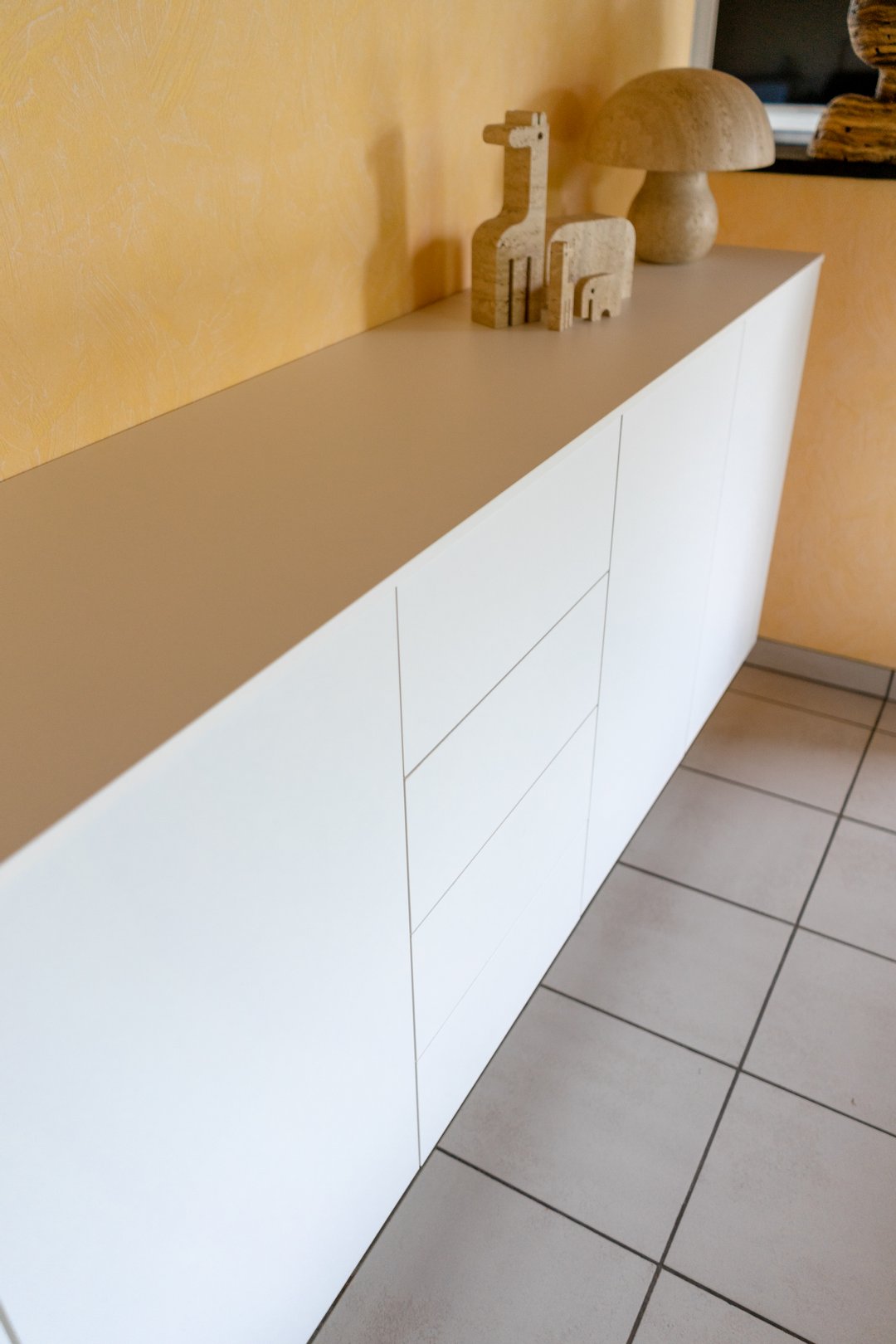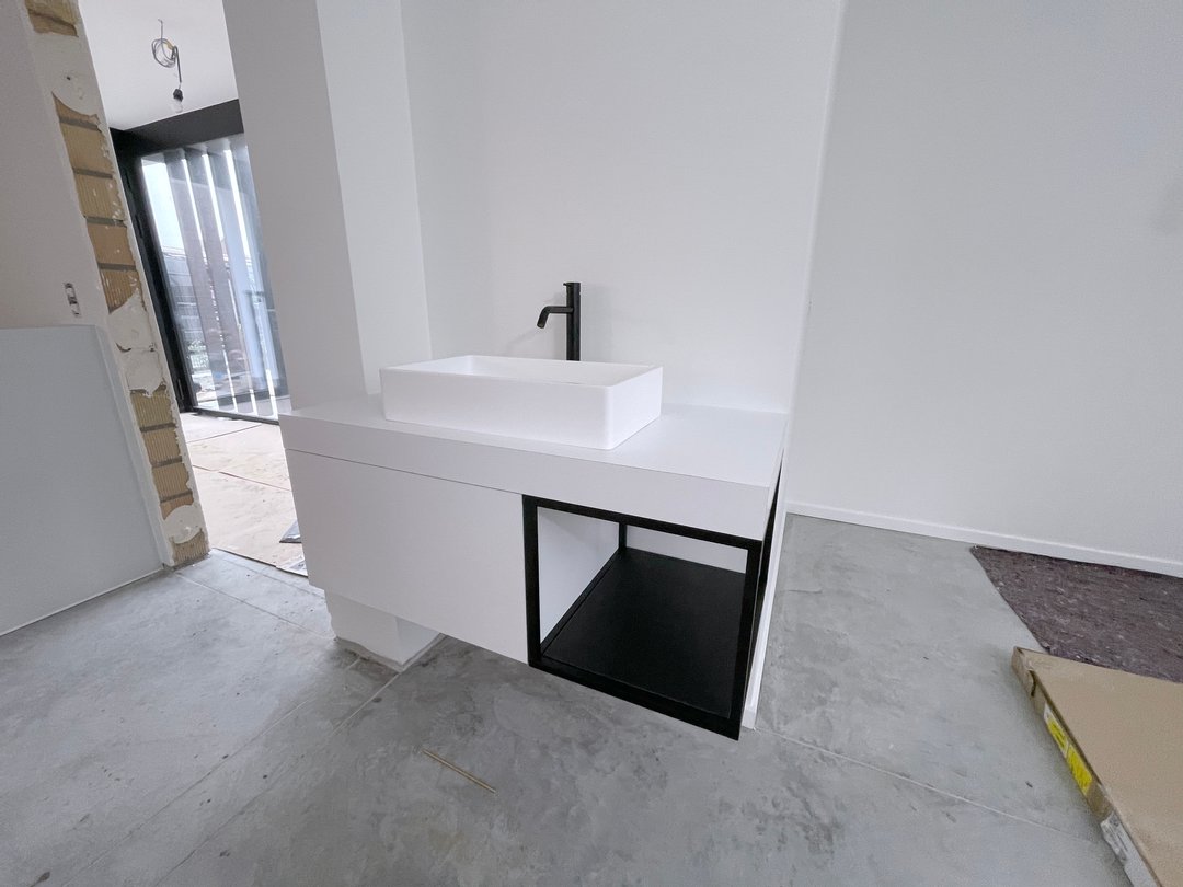 Om optimaal gebruik te maken van de oppervlakte van deze kamer zijn de kasten achter de deur minder diep. De kastdeuren en lades zijn te openen via tip-on. De kasten slaan steeds rustig dicht door middel van de blumotion scharnieren. Voor dit project kozen we de kleur van de kasten zodat ze mooi overeen zullen komen met de te verven muren.